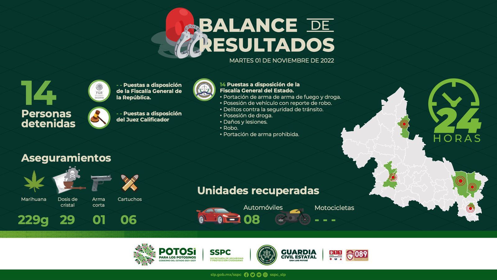 Balance de Resultados enviados por la Guardia Civil Estatal sobre la captura de presuntos delicuentes con un total de 14 los cuales se les vinculara en relación a proceso oral acusatorio vigente en nuestro Estado.
